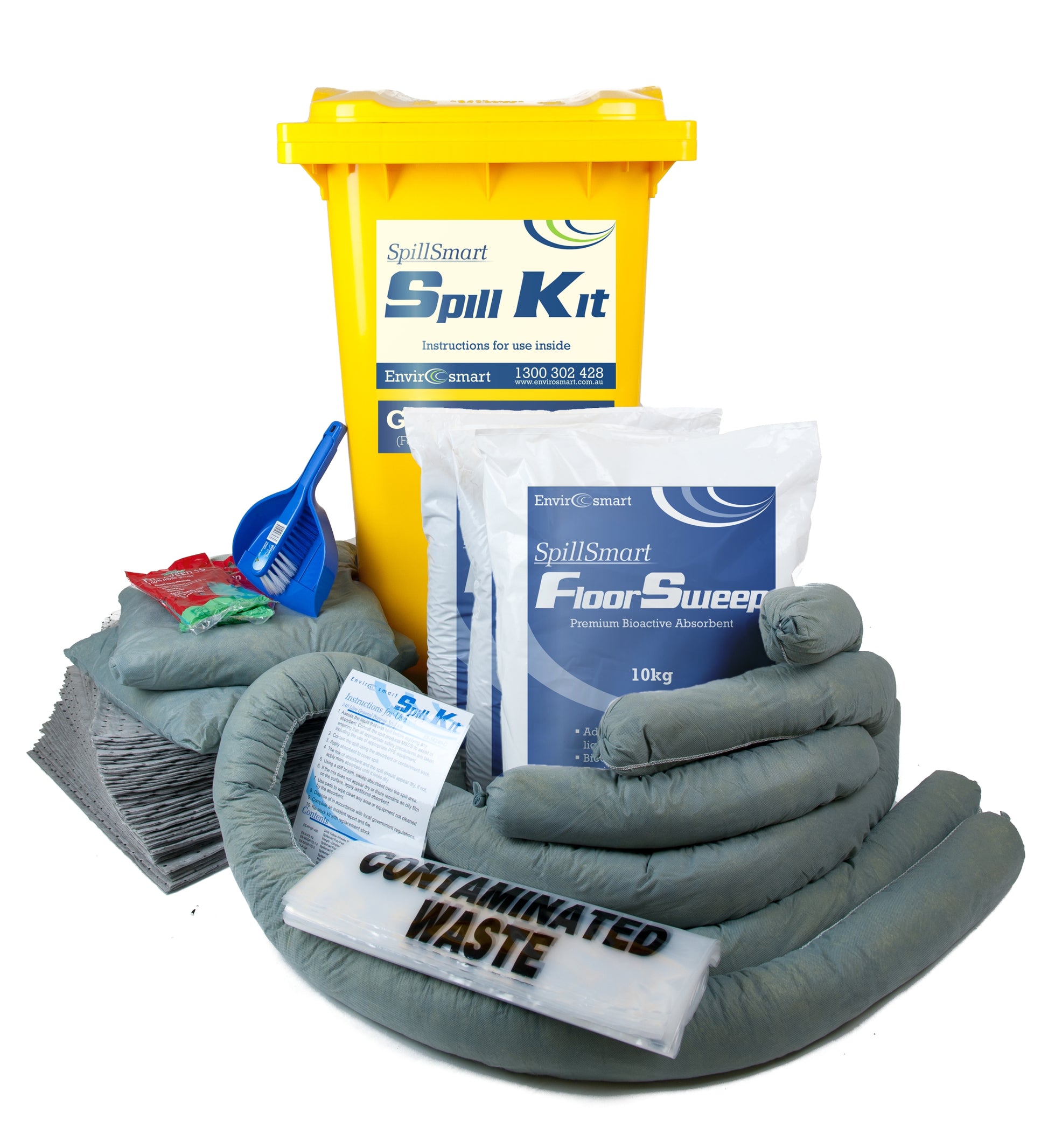 The 240L General Purpose Spill Kit contains 3 x 10kg bags of Floor Sweep, a fast acting highly effective bioactive absorbent, combined with premium 1.2m and 3m socks, pillows, pads, gloves and contaminated waste bags to ensure a spill can be cleaned up efficiently.